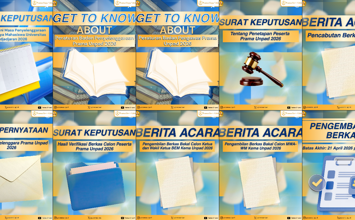 dJatinangor (26/4/2026) – Badan Penyelenggara Peserta Pemilihan Raya Mahasiswa (BP-Prama) Unpad resmi tetapkan enam mahasiswa sebagai Peserta Prama 2026 pada Sabtu (25/4). Penetapan ini disahkan melalui Surat Keputusan (SK) Nomor 009/A-b/BP/PRAMA/IV/2026 setelah agenda itu sempat batal tiga kali pada 5 April, 13 April, hingga 24 April.